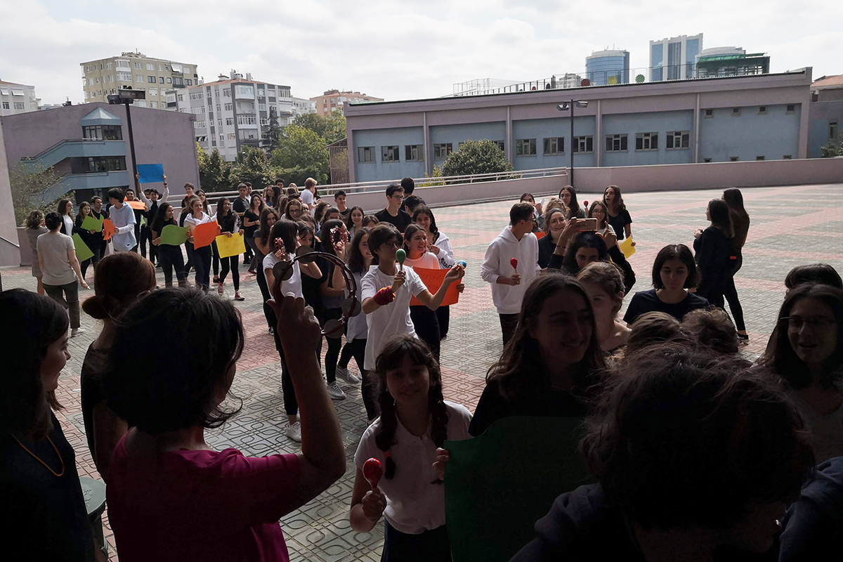 Hafta içinde iklim krizine ve iklim görevine vurgu yapan bir afiş hazırlayarak yürüyüşü duyurdular. Sınıfları dolaşarak arkadaşlarına hem 20 Eylül İklim Yürüyüşü, hem de Terakki’de ne yapabilecekleri konusunda bilgi verdiler. Böylece 19 Eylül Perşembe günü gönüllü tüm Terakki öğrencileri hazırladıkları pankartlarla önce lise binasında, sonra tüm yerleşkede yürüyerek iklim krizine dikkat çektiler.