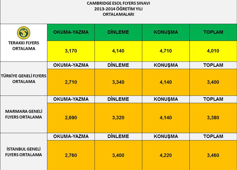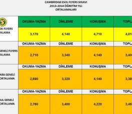 Cambridge Young Learners sınavları, öğrencilerin dil becerilerinin gelişimini güvenilir ve geçerli bir değerlendirmeyle ölçen bir sınav. 2013 – 2014 Öğretim yılına kadar okulumuzda 5. sınıflar düzeyinde uygulanan, geçtiğimiz öğretim yılı itibarıyla İngilizce Bölümü müfredatımızdaki yenilenmeler ve yeni uygulamalar doğrultusunda 4. sınıf öğrencilerimizin girdikleri Flyers sınavı, Avrupa Ortak Dil Çerçevesi (CEFR-Common European Framework of Reference for Languages) A2 seviyesine eşittir.
