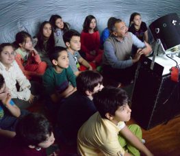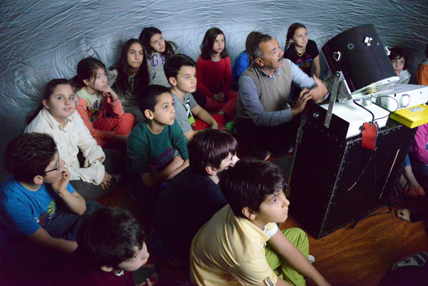 4. sınıflarımıza, kırk dakika süren gösteride o gece gökyüzünde bulunan yıldız ve gezegenler gerçek renk ve parlaklıklarıyla kubbenin iç yüzüne yansıtılarak, çıplak gözle görülebilen gezegenlerin yıldızlardan nasıl ayırt edileceği anlatıldı. Gösterinin ikinci bölümünde öğrencilerimiz, Samanyolu galaksisine dışarıdan giren bir uzay gemisindeymiş gibi önce yerküremize uzaydan baktılar, kıtalar, okyanuslar ve bulutları izlediler; gece ve gündüzün oluşumunu incelediler. Daha sonra öğrencilerimiz sırasıyla en yakın komşularımız olan Ay, Venüs ve Mars’ı yakından gözlemleyerek kırmızı gezegenin yüzeyindeki kanyonları, yanardağları ve buzlu bölgeleri yakından görme fırsatı buldular. Dev gezegen Jüpiter’e uydularıyla, halkalı gezegen Satürn ve uydularına da yakından baktıktan sonra Güneş’e gelip Samanyolu’nun dışına çıktılar.