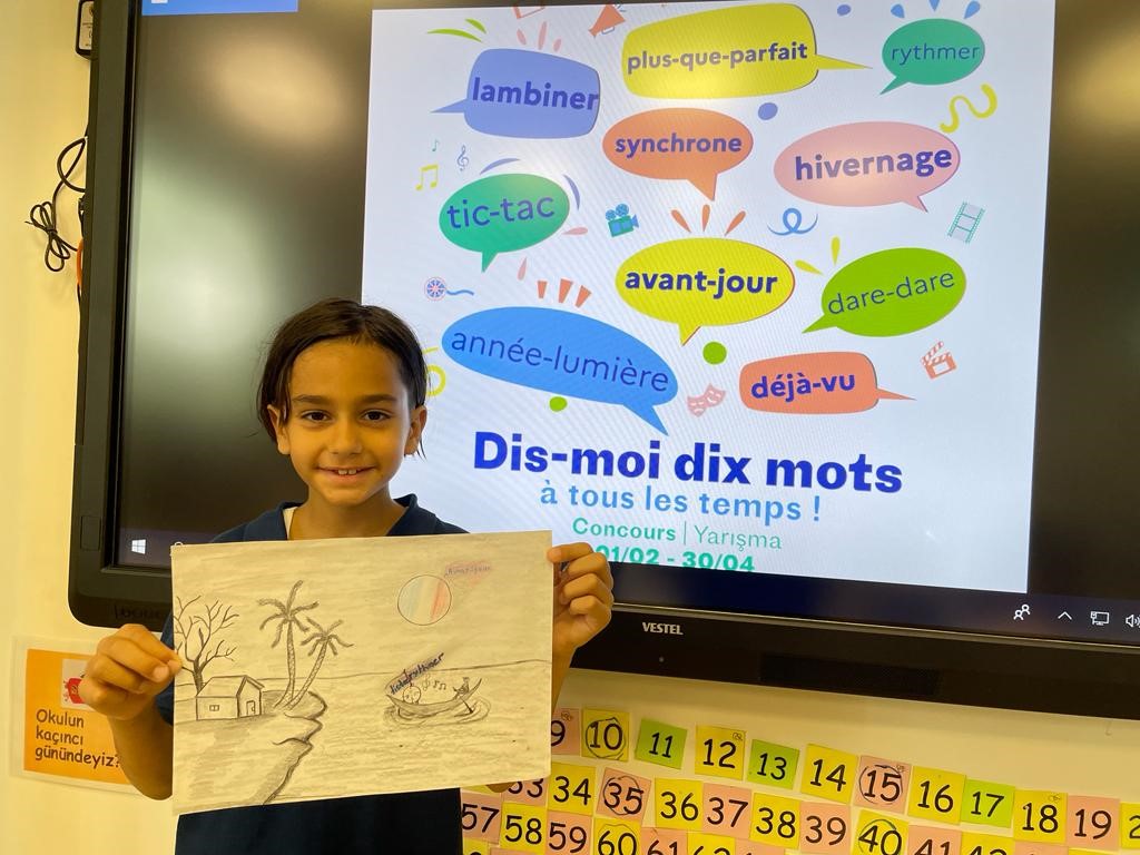 Öğrencilerimiz, Fransız Kültür Merkezi Türkiye’nin Frankofoni Baharı çerçevesinde düzenlediği “Dis-moi 10 mots (Bana 10 Kelime Söyle)” adlı yarışmaya katıldı. Kütüphane ekipleri ve Fransızca öğretmenlerinden oluşan jüri 315 eser içinden yarışmanın kazananlarını belirledi. 23 Mayıs Salı günü açıklanan sonuçlara göre Levent Yerleşkemizden öğrencimiz Beliz Kurt (5I) ortaokul kategorisinde 2., Tepeören Yerleşkemizden öğrencimiz Bora İmral (4A) ilkokul kategorisinde 3. oldu.