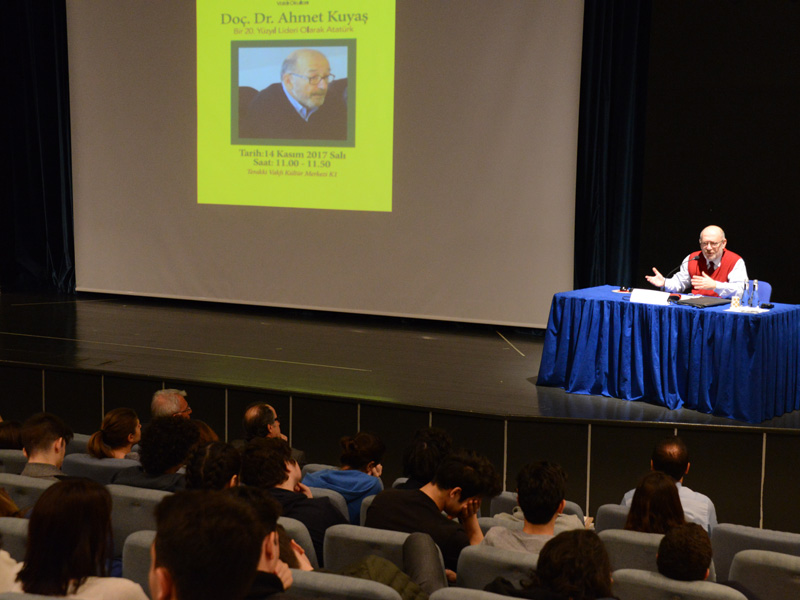 Doç. Dr. Ahmet Kuyaş, 10 Kasım Atatürk’ü Anma Haftası etkinlikleri çerçevesinde 14 Kasım Salı günü Levent Yerleşkemizde konuğumuz oldu. Terakki Vakfı Kültür Merkezi K1’de lise 10 ve 11. sınıf öğrencilerimizle buluşan Kuyaş, “Bir 20. Yüzyıl Lideri Olarak Atatürk” konulu bir konuşma yaptı. Lise öğrencimiz Mert Demirbağ (11 IB I) bu konuşmayla ilgili görüşlerini şu şekilde paylaştı:
