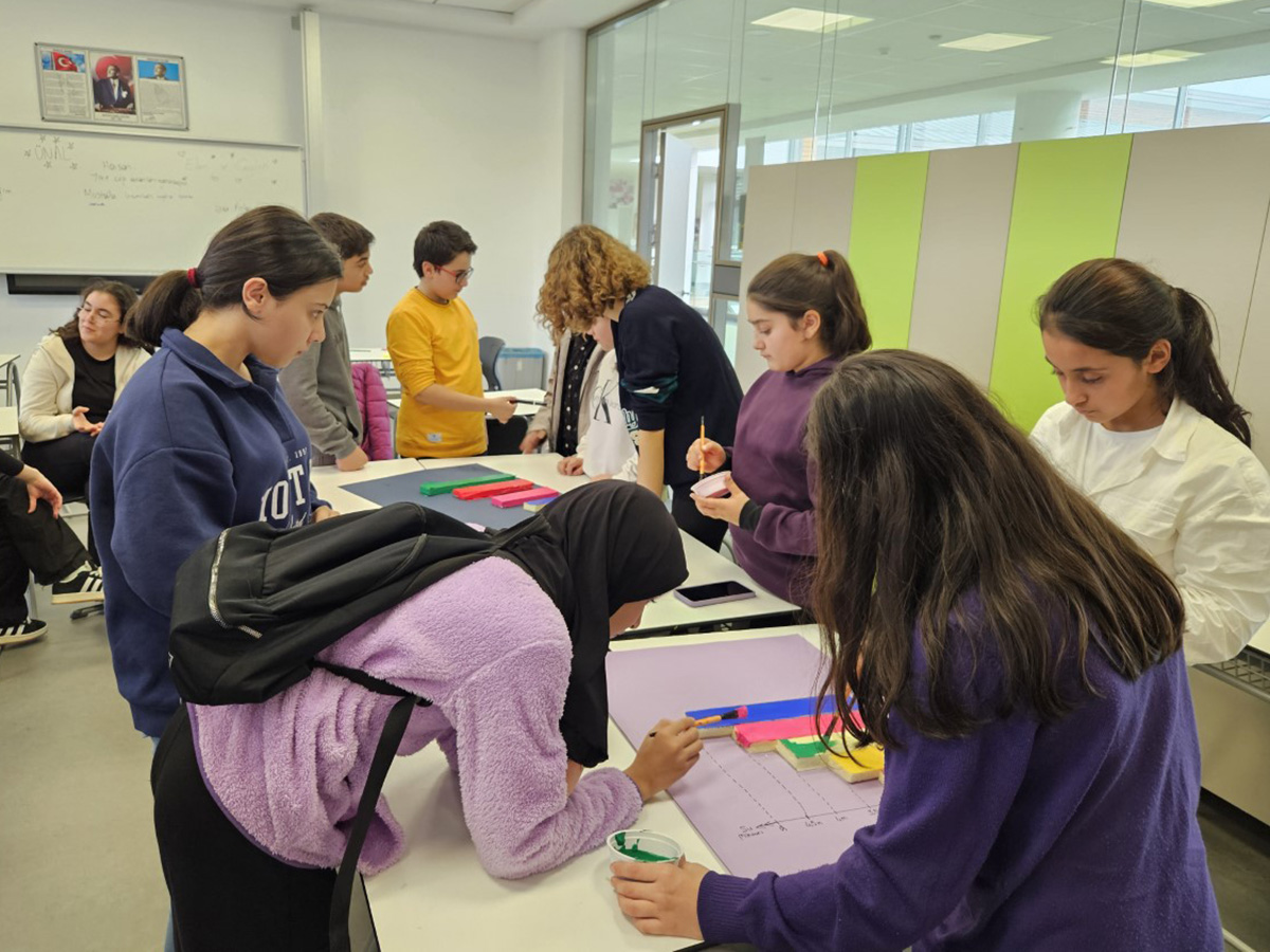 Matematik Bölümünden Ünal Kurt’un rehberliğinde hazırlanan ”Doğa İçin Verilerle Boya” matematik atölyesinde; Ceylin Ela Berber (10IBD), Elen Çakır (10IBD), Nilüfer Güral (11A), Tuğçe Sıla Gemeç (11C) görev aldı. Bu atölyede öncelikle atık su kullanımı ile ilgili bir bilgilendirme yapıldı. Ardından gruplara ayrılan öğrenciler, çeşitli materyalleri kullanarak kendilerine verilen verilerle kendi sütun grafiklerini oluşturdu. Bu çalışmalar, temamıza ve öğrenci seviyesine uygun şekilde öğrencilerin, analitik düşünebilme ve grafik oluşturabilme becerilerini geliştirmelerine katkı sağlandı.