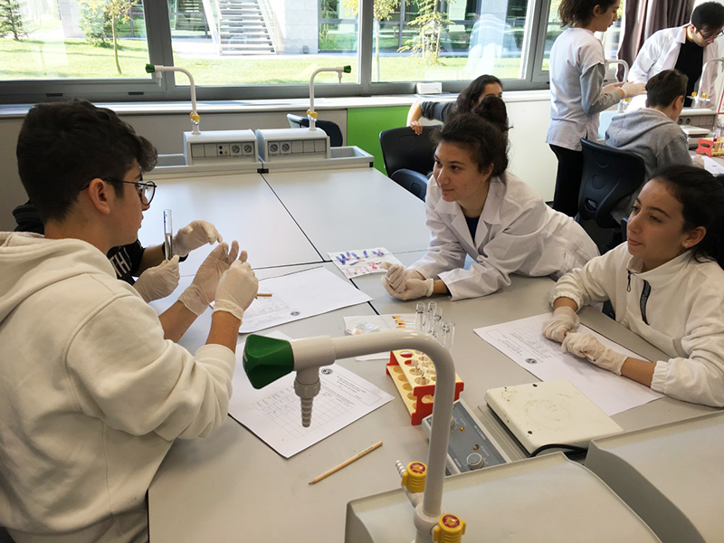 Kimya Laboratuvarında gerçekleştirilen Kimya atölyesinde ise, ağız sağlığımızı tehdit eden yiyeceklerin neler olduğunu tartıştılar. Bu doğrultuda tükettiğimiz yiyeceklerin içerdiği maddelerin asidik mi, bazik mi olduğunu ortaya koyan bir deney yaptılar. Deneyde öğrenciler limon suyu, soda, şekerli su, sirke, kabartma tozu, süt ve diş macununu indikatörler yardımıyla test ettiler ve gözlem sonuçlarını raporladılar. Daha sonra bu gözlemleri ve deney sonuçlarını tartıştılar.