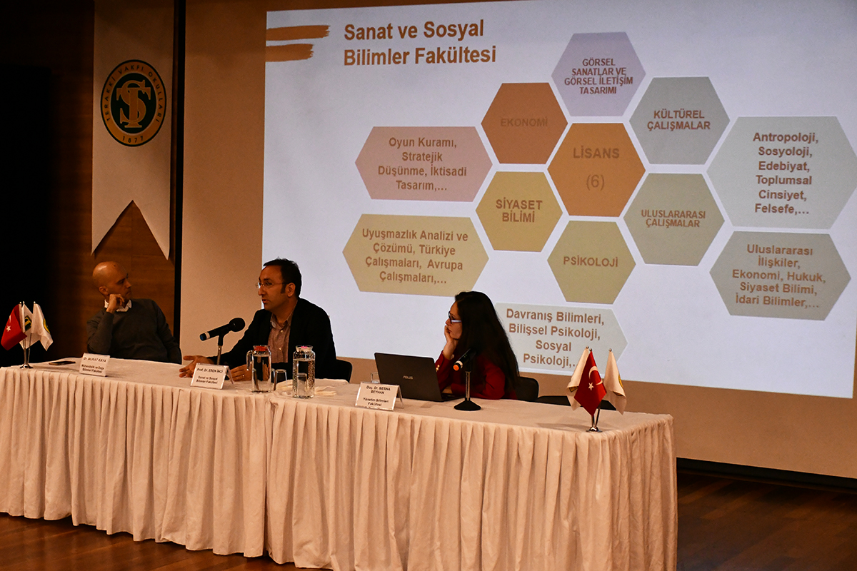 Konferans Salonumuzda düzenlenen panelin moderatörlüğünü Psikolojik Danışmanımız Filiz Koçak üstlendi. Bu panelde Sabancı Üniversitesi Sanat ve Sosyal Bilimler Fakültesi Dekan Yardımcısı Prof. Dr Eren İnci; Sanat ve Sosyal Bilimler Fakültesi hakkında bilgi vererek, fakültenin lisans programlarını tanıttı. Fakültede bulunan Ekonomi, Görsel Sanatlar ve Görsel İletişim Tasarımı, Kültürel Çalışmalar, Psikoloji, Siyaset Bilimi ve Uluslararası Çalışmalar Bölümlerinin derslerini, mezunlarının çalışma alanlarını anlattı. Ayrıca öğrencilerin üniversiteye ilk geldikleri yıl kesin bir bölüme karar veremediklerinde, Sabancı Üniversitesi’ndeki farklı bölümlere geçebilme imkânının bu süreçte onlara yardımcı olduğunu paylaştı.