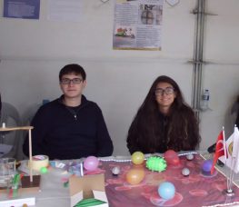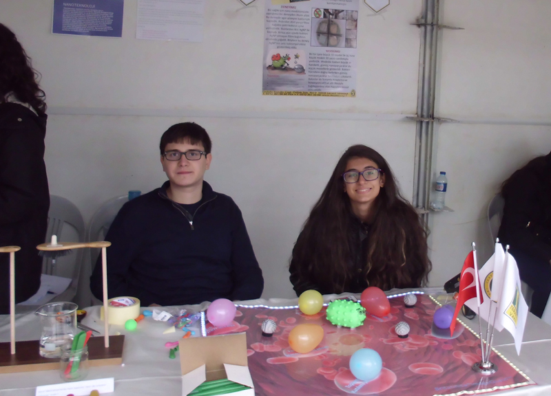Fen lisesi 10. sınıf öğrencilerimiz Deniz Can Temel ve Şirin Yağmur Abacı, sağlık alanında nanoteknoloji uygulamalarını esas alan “3-D modellerle Bakteri Nanoparçacık Etkileşimi” ürününü kimya öğretmenleri Reşat Saravin’le birlikte ziyaretçilere tanıttılar.
