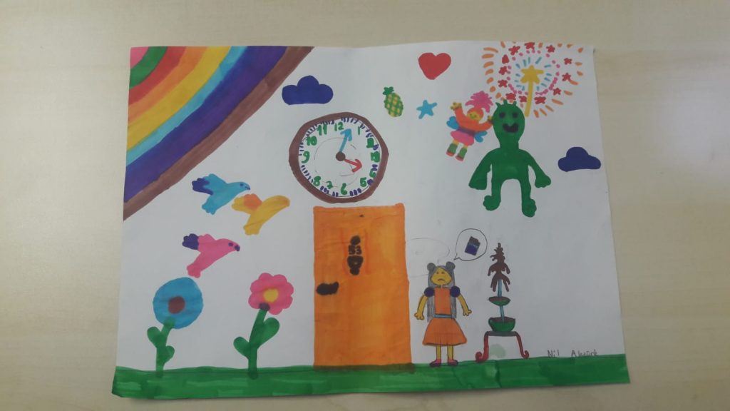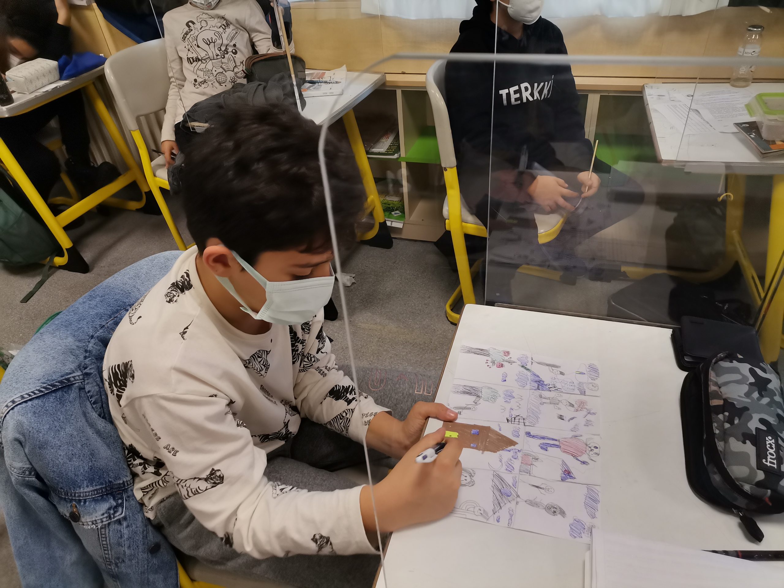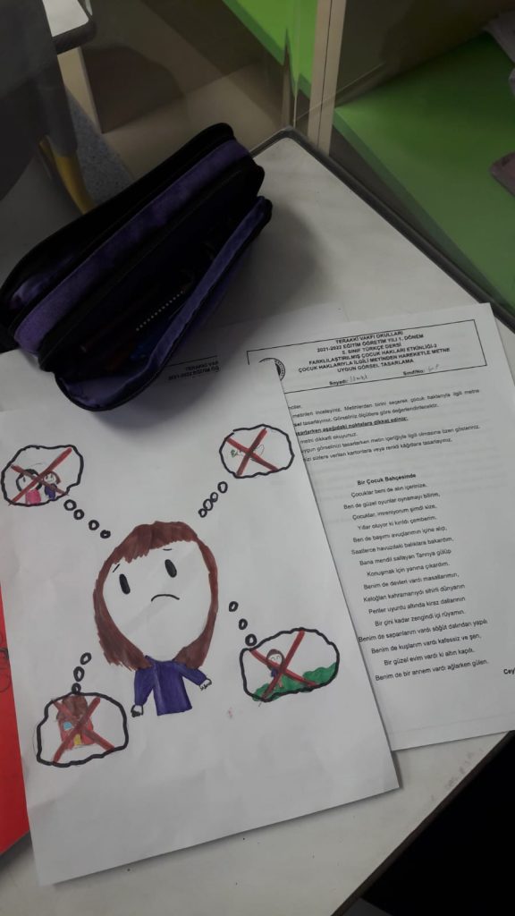 Çalışmalarımızın son aşamasında onlara verilen “Farklılaştırılmış Çocuk Hakları Etkinlikleri”nden birini seçerek bireysel veya grup olarak kurgusal bir çocuk karakter yaratıp onun ağzından çocuk haklarının ihlaliyle ilgili yazılar yazdılar. Çocuk haklarıyla ilgili bir metinden yola çıkarak metne uygun görsel tasarladılar. Metinde yer alan çocuk haklarıyla ilgili bir sorunu tespit edip ve soruna uygun çözüm veya çözümler ürettiler.