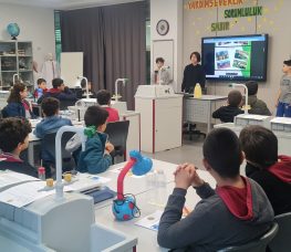 Bu doğrultuda, karbon ayak izini azaltmak ve iklim krizi hakkında farkındalığın artmasını sağlamak amacıyla çeşitli birçok çalışma gerçekleştiren öğrencilerimiz, İklim Değişikliği Atölyesi de düzenleyerek, tasarladıkları deneyleri, laboratuvarlarında Cemil Türker Ortaokulu öğrencileriyle birlikte yaptılar. Ardından proje çerçevesinde okul bahçesine ektikleri fıstık çamı fidanlarını ve ot spiralinin olduğu alanları tanıttılar. Öğrencilerimiz, akranlarına ot spirali hakkında bilgiler verdikten sonra ormansızlaşmanın önüne geçme konusunda bilinç yaratmak için onlara 10 adet fıstık çamı hediye ettiler. Günün sonunda, Okul Müdürümüz Saadet Tarakçı ve Cemil Türker Ortaokulunun Müdürü Osman Gökhan Çam, öğrencilerine atölyeyi başarıyla tamamladıkları, iklim değişikliği ve çevre bilinci konusunda farkındalıklarını artırdıkları için katılım sertifikalarını verdi.