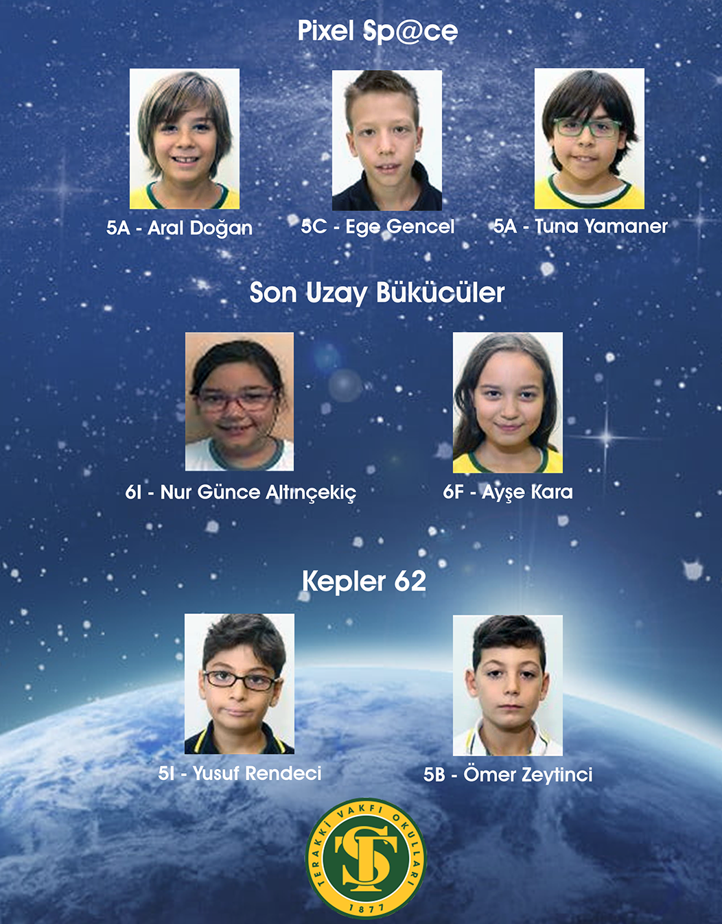 Finale kalanlar: Tepeören Yerleşkemizden Aral Doğan (5A), Ege Gencel (5C), Tuna Yamaner’in (5A) “Pixel Sp@ce”; Levent Yerleşkemizden Nur Günce Altınçekiç (6I) ve Ayşe Kara’nın (6F) “Son Uzay Bükücüler”; Levent Yerleşkemizden Ömer Zeytinci (5B) ve Yusuf Rendeci’nin (5I) “Kepler 62”  idi.