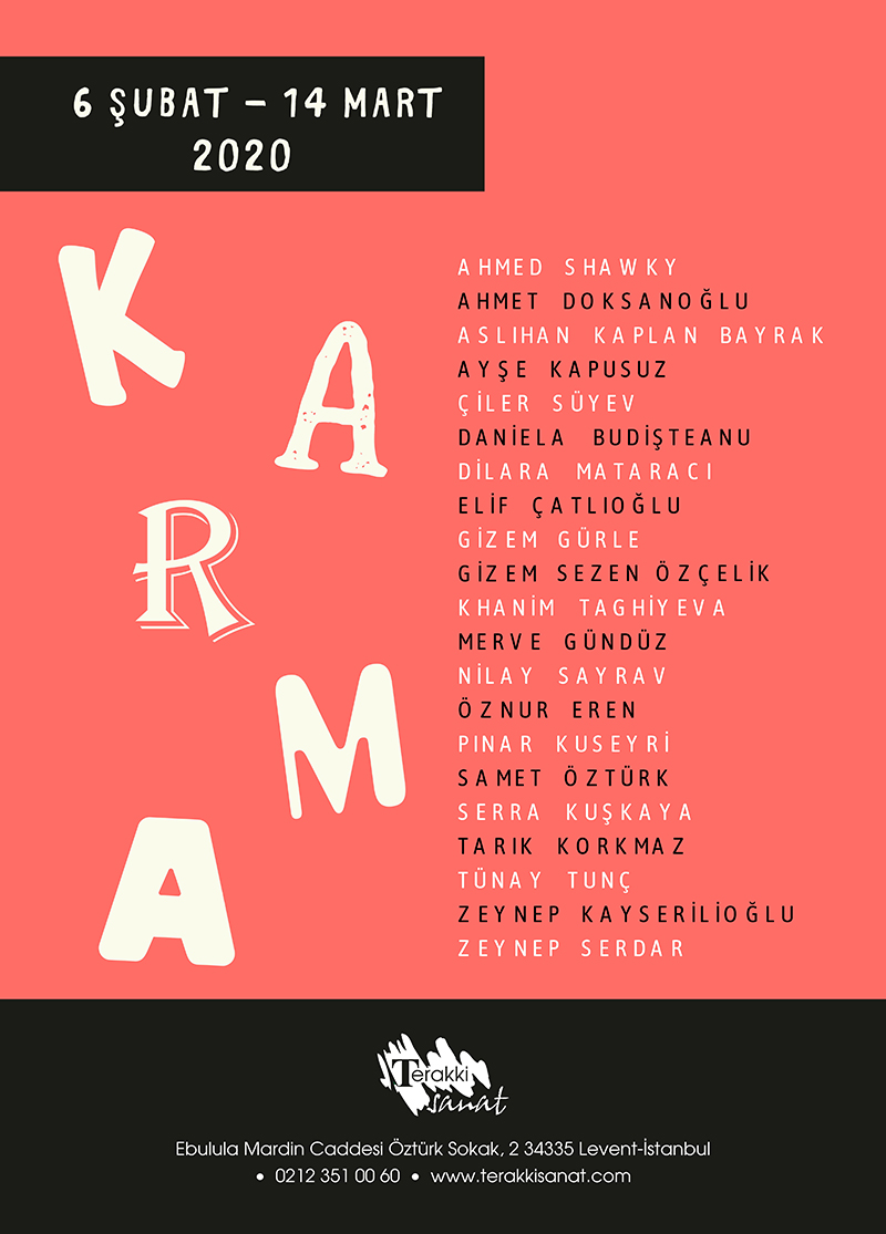 Terakki Sanat, 6 Şubat-14 Mart 2020 tarihleri arasında, Ahmed Shawky, Ahmet Doksanoğlu, Aslıhan Kaplan Bayrak, Ayşe Kapusuz, Çiler Süyev, Daniela Budişteanu, Dilara Mataracı, Elif Çatlıoğlu, Gizem Gürle, Gizem Sezen Özçelik, Khanim Taghiyeva, Merve Gündüz, Nilay Sayrav, Öznur Eren, Pınar Kuseyri, Samet Öztürk, Serra Kuşkaya, Tarık Korkmaz, Tünay Tunç, Zeynep Kayserilioğlu ve Zeynep Serdar’dan oluşan ‘’Karma’’ sergisine ev sahipliği yapıyor.
